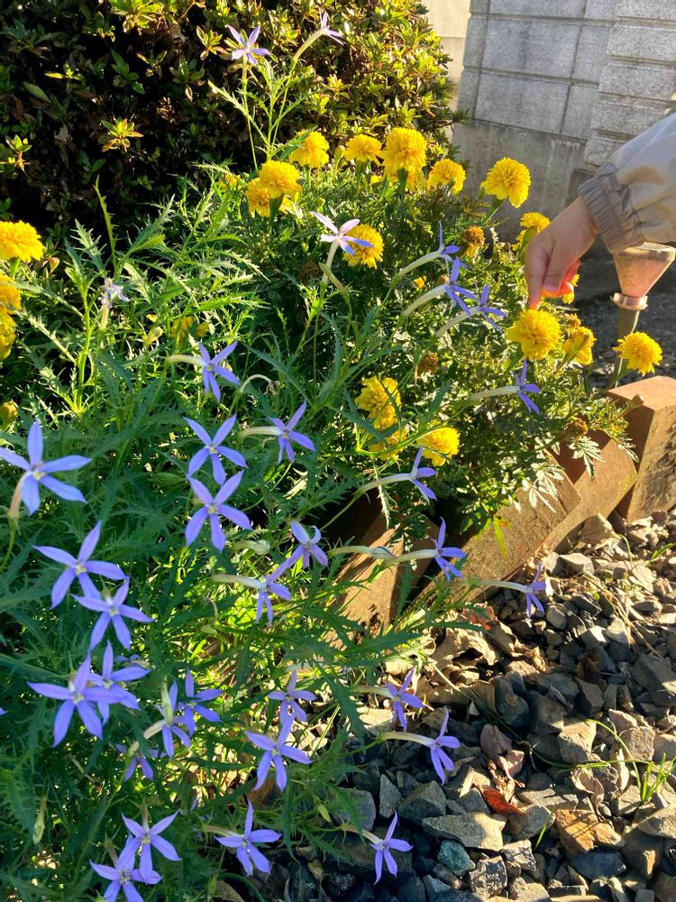 夫の実家の花壇はマリーゴールドとイソトマがまだまだ満開です