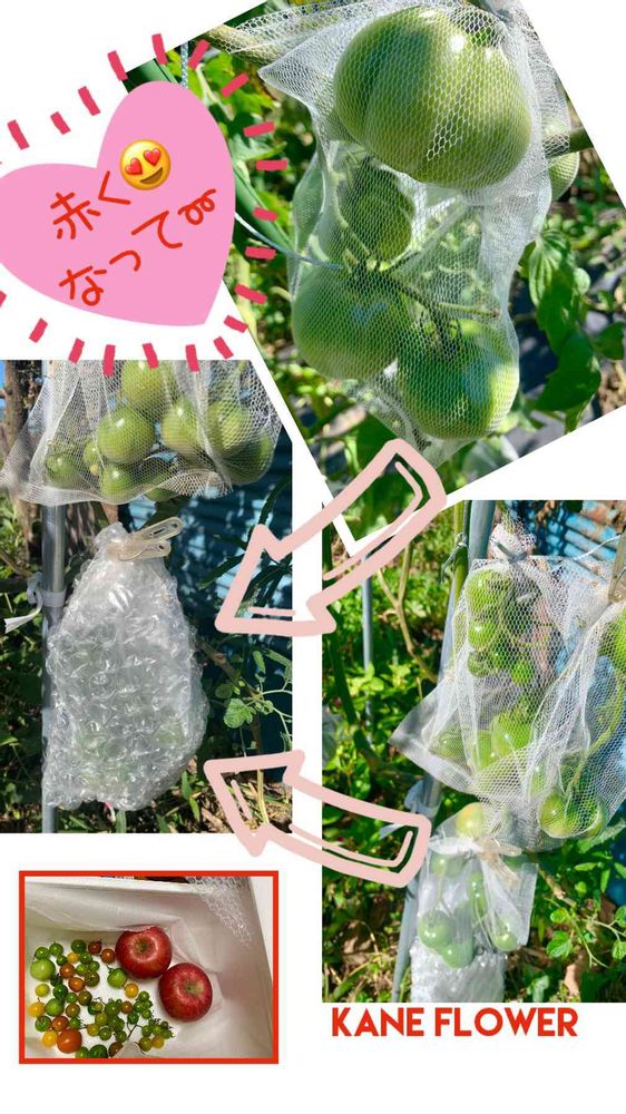 ②虫除けにネットしていたうち何房かのトマトだけを袋状にしたビニールに入れ底両端をカット✂️してみました(ノ∀`笑)