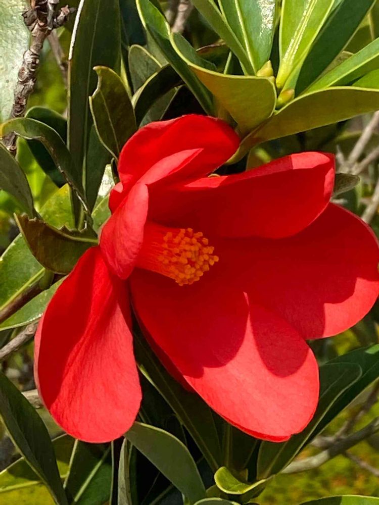 真夏から咲いているらしく、ツバキとは思えない細長い花弁、そしてあのツヤツヤの葉っぱとは形もつき方も違います。パッと見るとハイビスカスのよう。ツバキとわかるのは雌しべを取り囲む雄しべの壁。