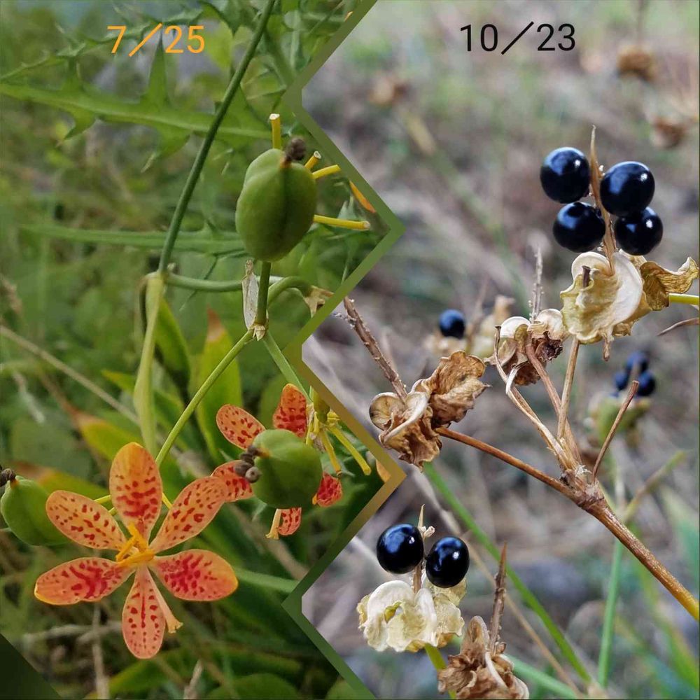 檜扇あやめら紫とピンク色のお花とも又違った趣き、どたらもこの真っ黒な黒い実がなりまるのですね、お花は見たことあるのですが、この黒い実は見た事ありません✨