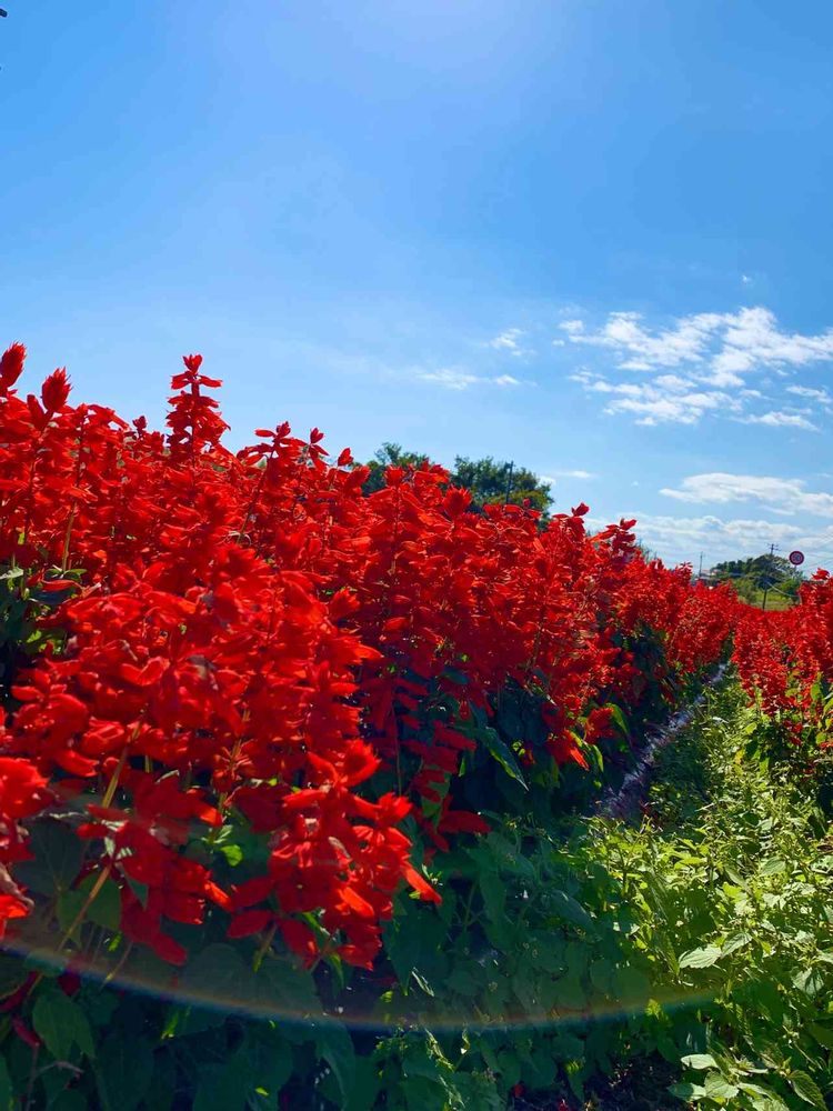 サルビアの紅とグリーン、空の青、素敵な構図ですね❣