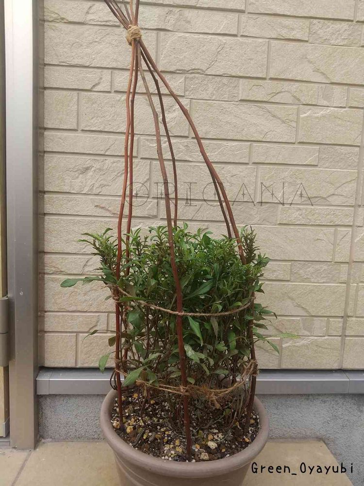 支柱作戦は悪くはなかったと思います。これをやらずに台風に晒したら、たぶんここまで青々とはしてなかったでしょう。それでもどうしても乱れがちなので、上のヒモはわりと最近に追加しました。ぶっちゃけ窮屈に見えるかとは思いますが、遺憾ながら花どころか蕾もありゃしませんしね……。これで花がついていたらもう少し枝先を遊ばせてナチュラルに仕立てるところですけれど。
