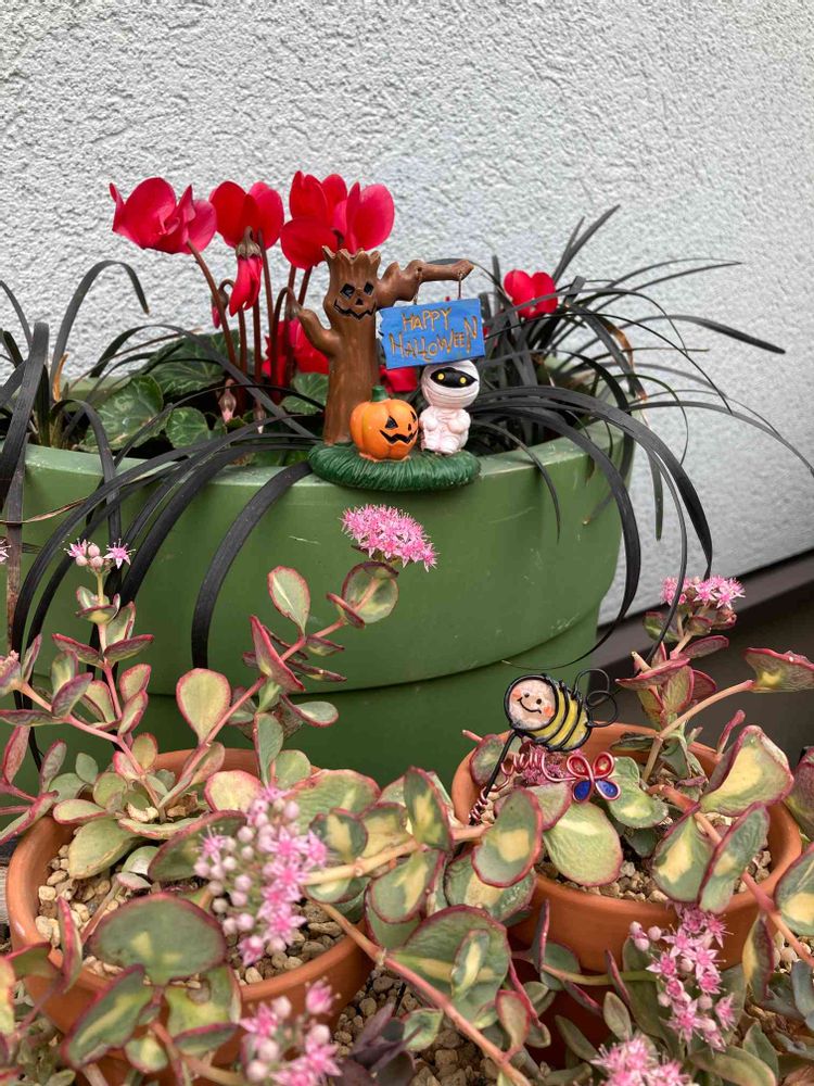 玄関の寄せ植えにハロウィンのオブジェを載せて…