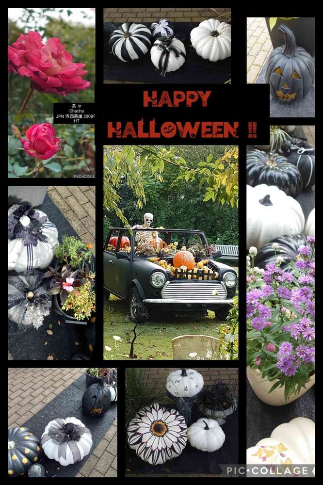イングリッシュガーデンのお洒落なモノトーンのカボチャたちと、💀と車