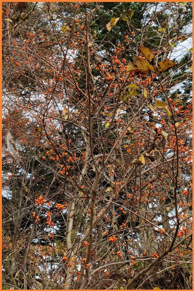 葉っぱが全て落ちた木が、ツルウメモドキでオレンジ色に染まってました🌕️🌕️