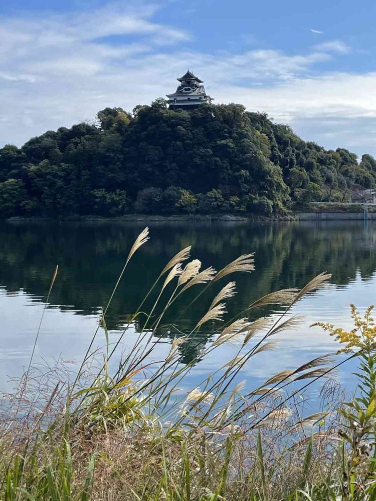 犬山城と木曽川、ススキがいい感じに傾いてました。