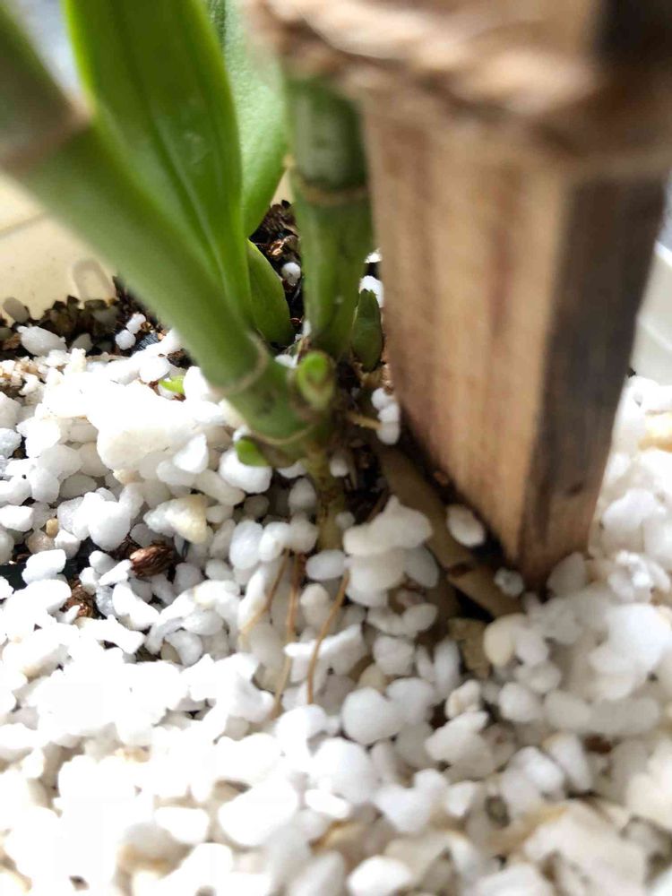 しわしわだったカトレアのバルブ、パーライトとクンタンに植え替えたらピンとなって新芽まで出してくれました〜