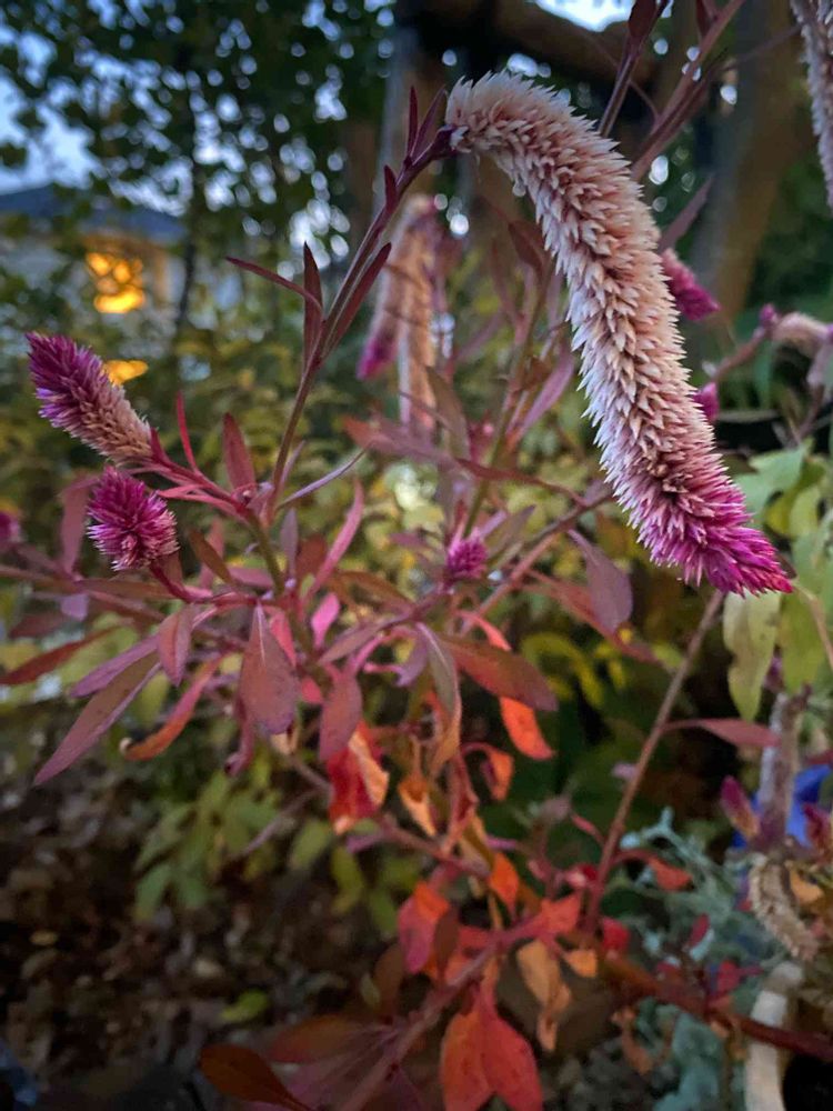 もはや形が崩れすぎて全体を写せない寄せ植えのセロシアがこの枝1本だけ秋らしくいい感じです🎃💦