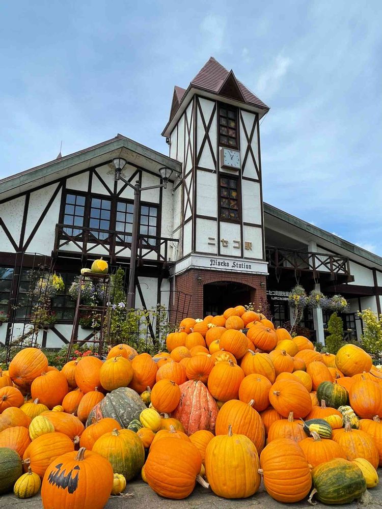 毎年、ニセコ駅はハロウィンかぼちゃでオレンジ色に染まり、秋の風物詩となっています。