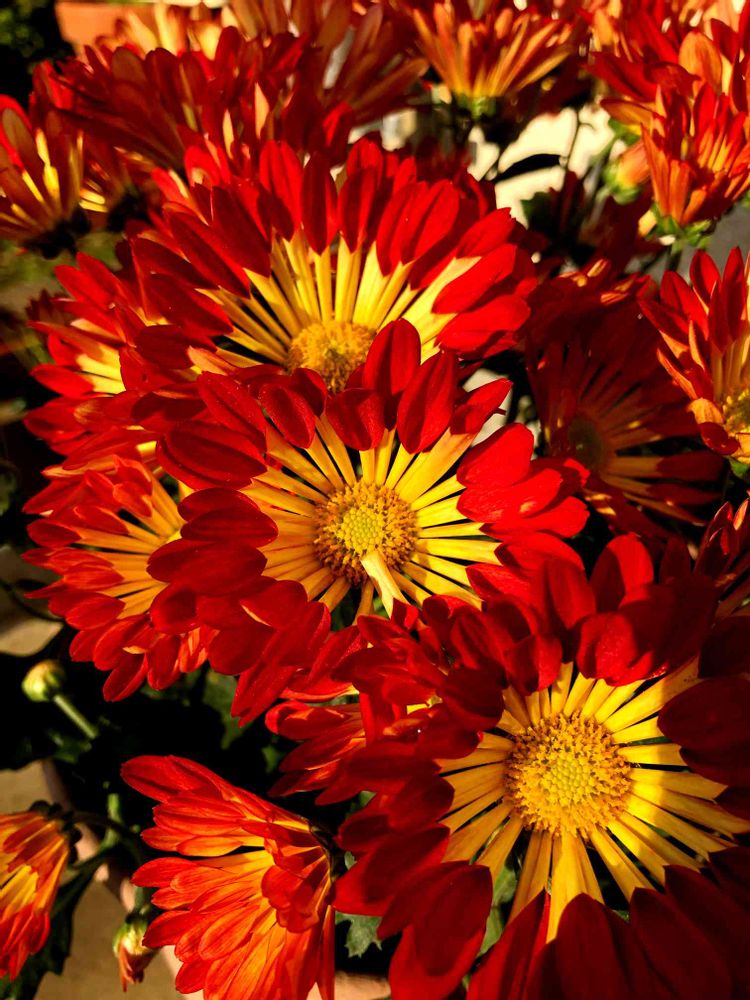 秋は、菊ですね。今年購入したスプレーマムは、スプーン咲きです。黄色を赤色で囲んで、パッションを感じます。