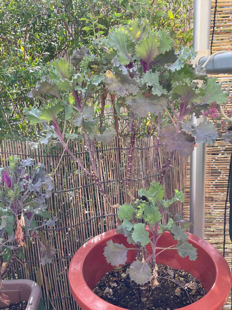 [@id:1815636] さん、色々🪴みていただき有難う^_^ ございます。種蒔きからの葉ボタン😅鉢数が多くて植え替え前のpic5日前と姿が変わりました 頭が大きくなったらどうなる🤨折れる?垂れる?ウーン🤔🤭🙄支柱?する?