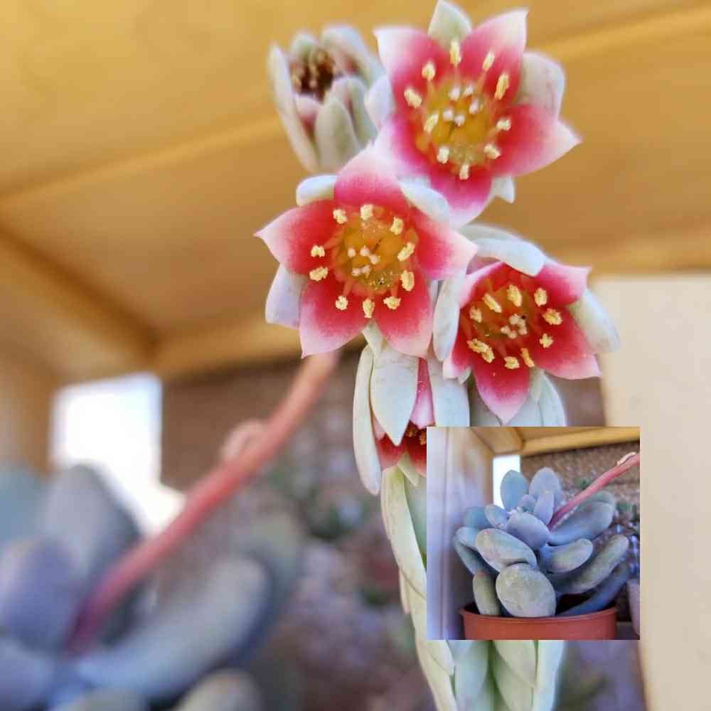 うちにも、同じような多肉ちゃんがいて、同じような花を咲かせています💕ただ、名無しちゃんなんです。