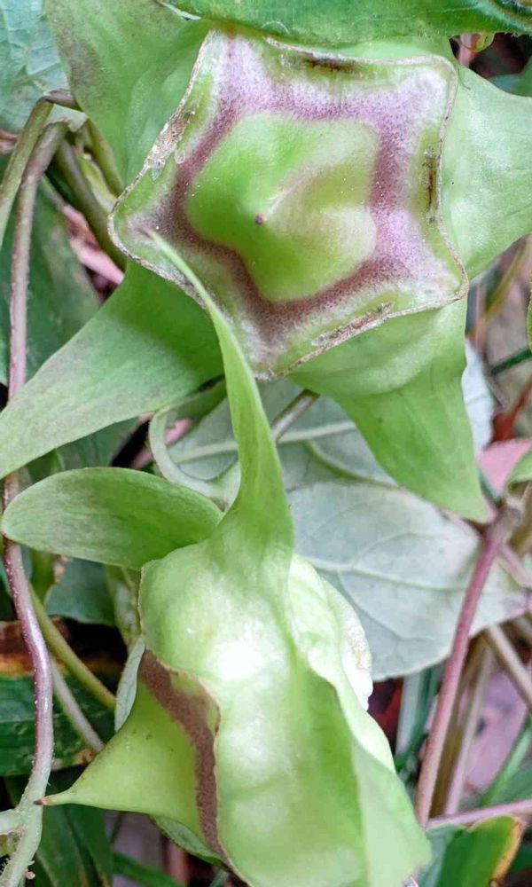 花弁の内側にあった輪のような模様が残った、若い実が出来ている。丸かった花をペシャンと潰したような、独楽のような形だ。ガクもしっかりと開いて面白い姿の つる巻き月曜日🏷️