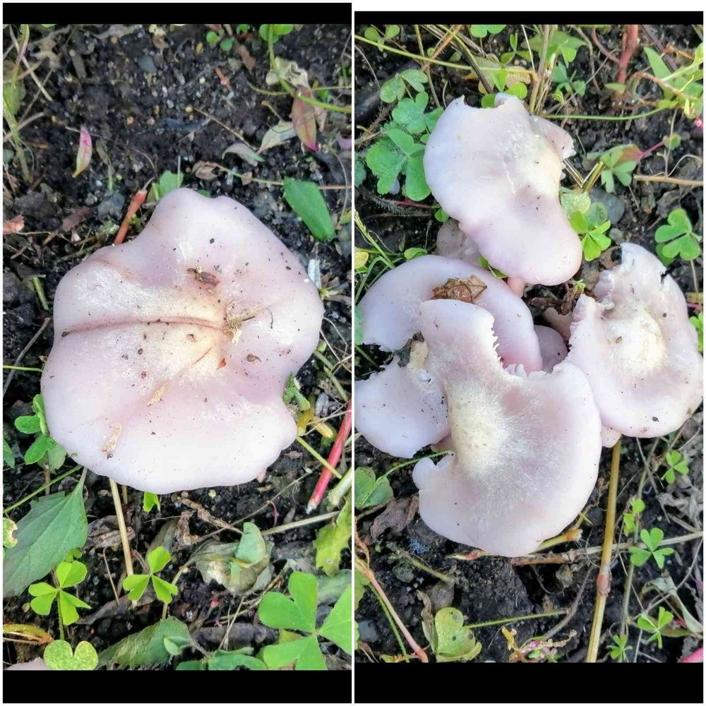 ハタケシメジと言うキノコがありますが日にちも雨に濡れているので微妙ですね😅コムラサキシメジの事を言っているのかも知れませんね それなら食べられます