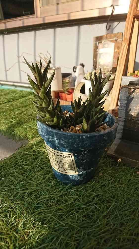 またまたmerrybellさんのありがとうセールin寝屋川ショップでゲットした『九輪塔』(ハオルシア 硬葉) 大好きブルーの鉢も気にいって即お買い上げでした😄