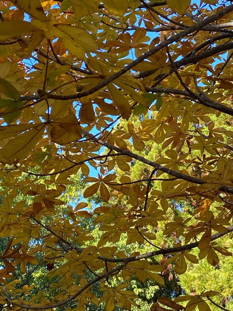 空を見上げると、綺麗に黄色くなったトチノキの葉っぱが青空に透けているように見えます✨✨✨