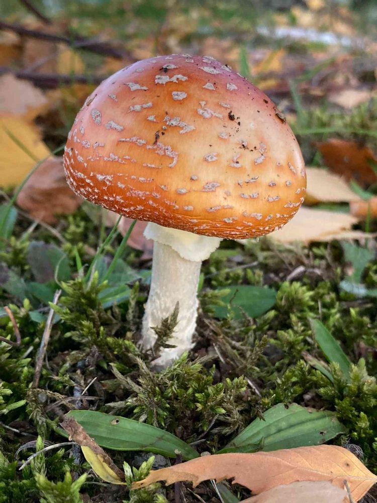 写真を撮ったのが夕方だったのと、この🍄は特に色が薄かった為ちょっと色がオレンジがかって見えますが、テングタケのような茶色ではなかったのでベニテングダケの方だと思います!