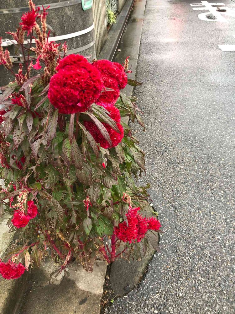 電柱と歩道のコンクリートの隙間からたくましく咲くケイトウ❤️