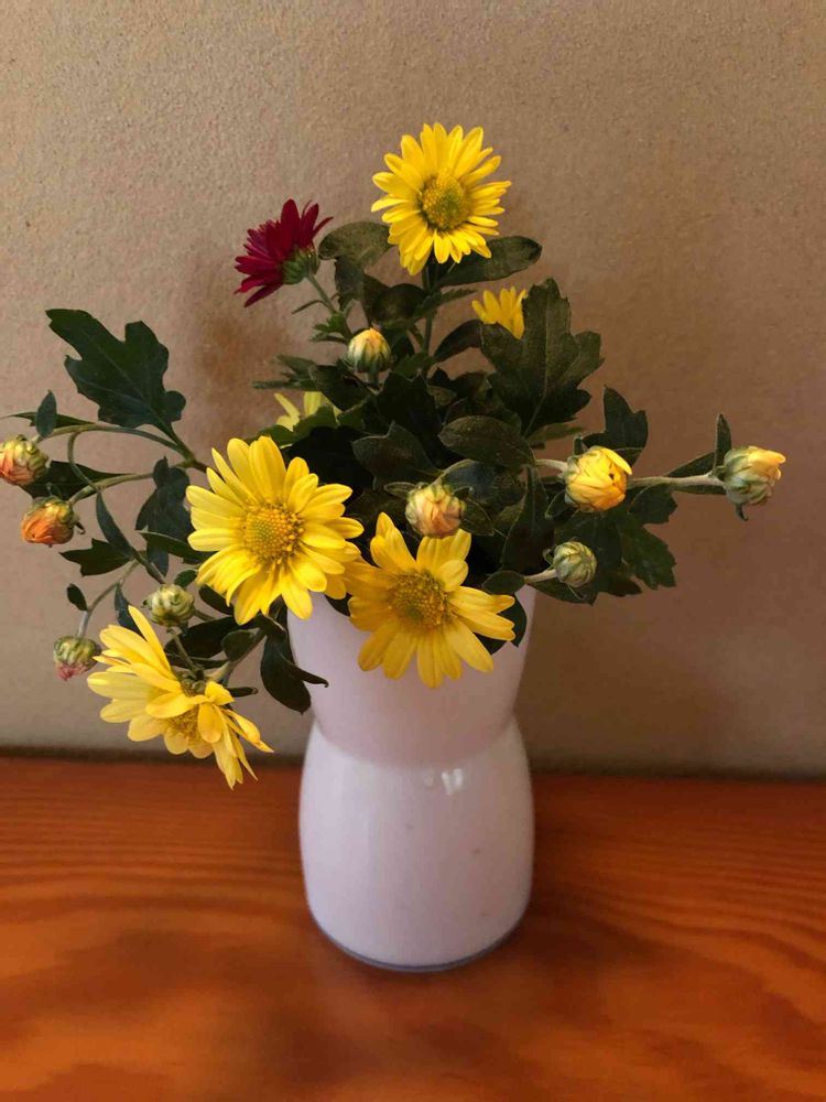 庭で咲き始めた小菊を小さな花瓶に挿してみました🌼🌿