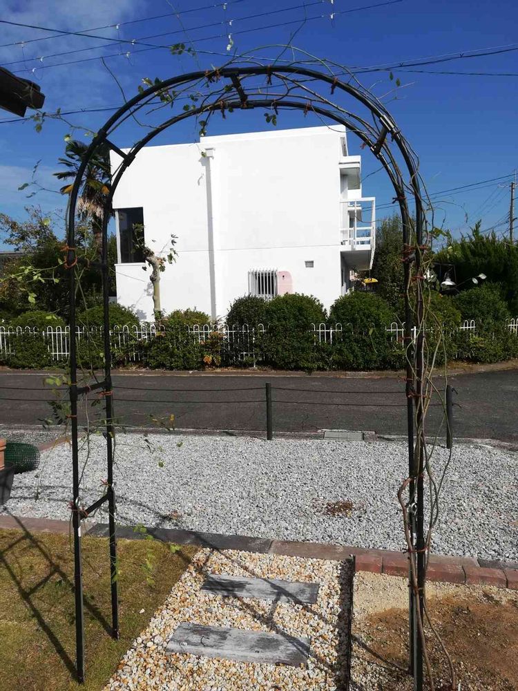 玄関横の壁に這わせていた鉢植えのつるバラ🌹地植えにしてア−チに這わせてもらいました。すっきりし過ぎのようだけど、来年の春には、また花を楽しめそうです☺️
