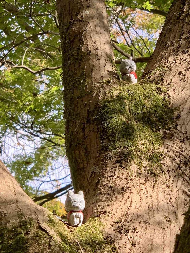 苔の生えた大きなもみじの木🌲動物村のお地蔵さんが、みんなの幸せを祈ってました🙏🍀🍀🍀❤️