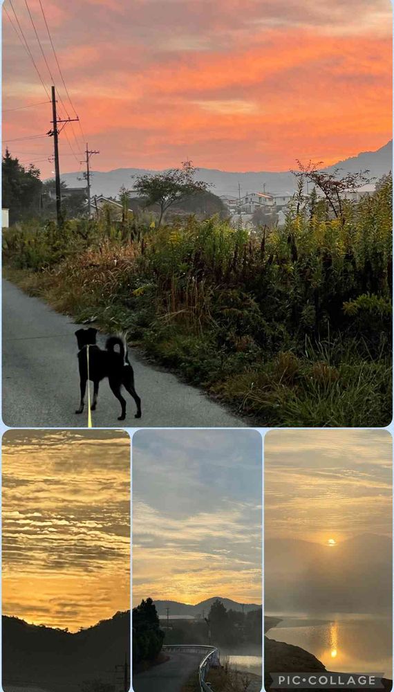 太陽が出た途端に朝霧が濃くなったので、とても幻想的な朝になりました。よしくんは何を見てるのかな。🐕🦺💨💨💨
