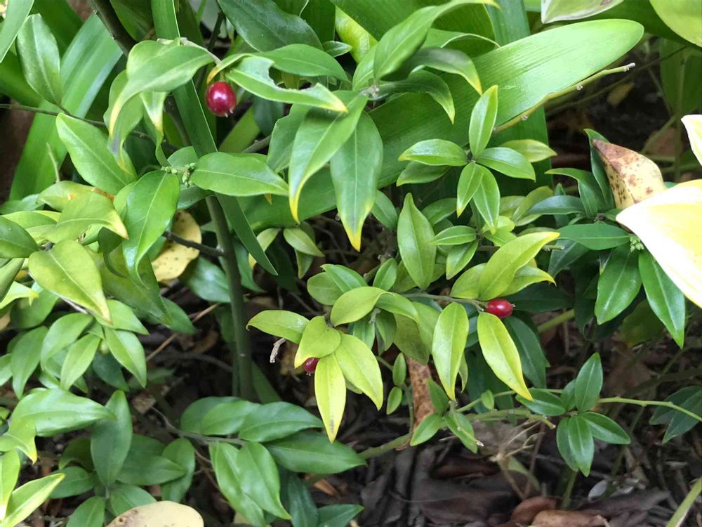 植え込みの中 下の方でツヤツヤの葉に赤い実がありました。