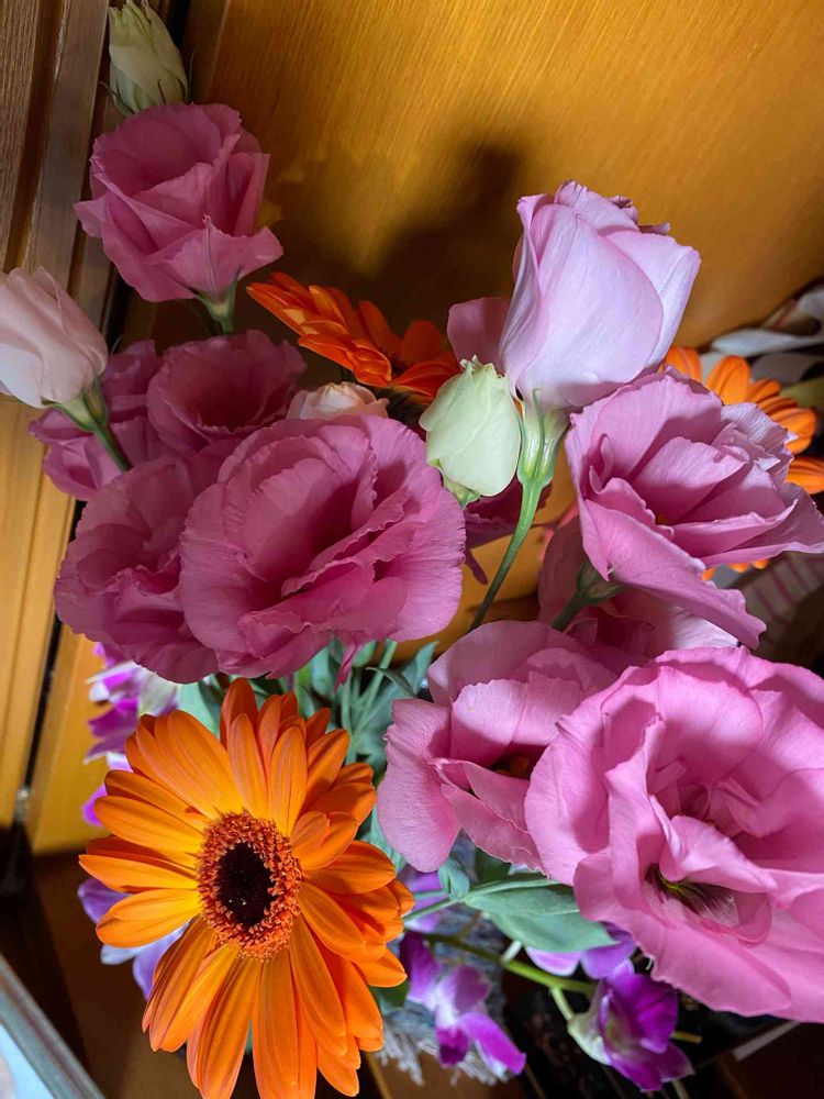 今日はトルコキキョウのピンクとガーベラのオレンジ。