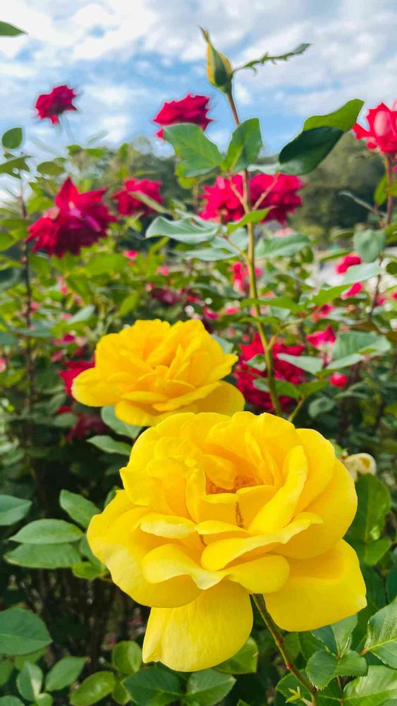 さすがなこさんっ‼️後ろの赤い薔薇がアクセントになってよりこの黄色い薔薇が引き立って見えるなと思い投稿しました😚
