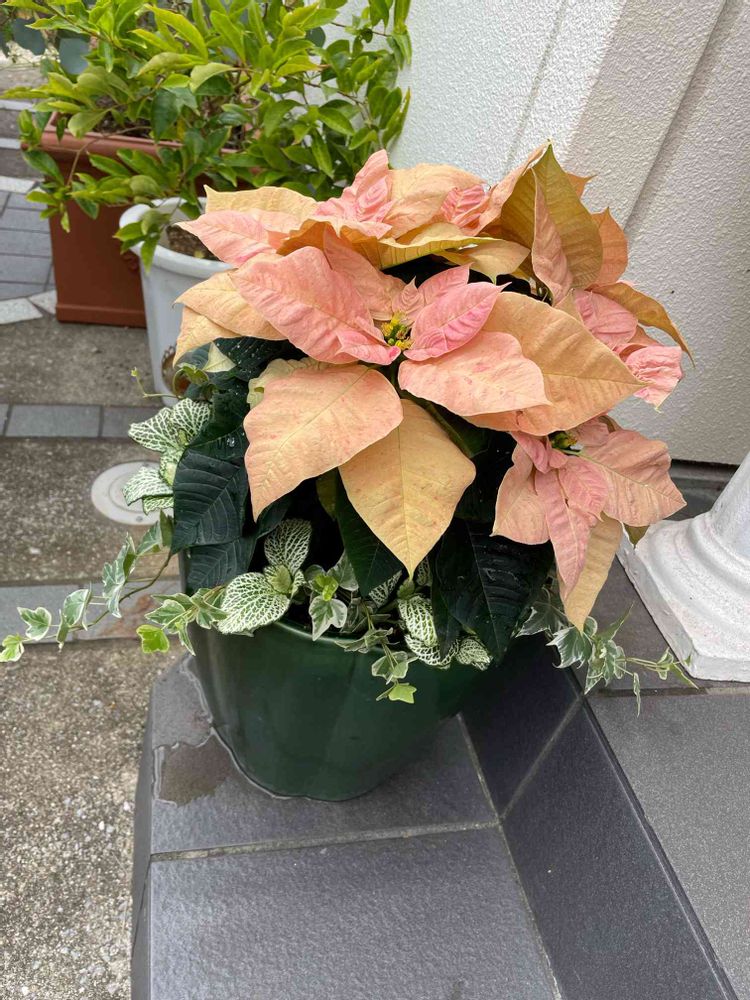 今日は、先日作ったガーデンシクラメンの寄せ植えの隣に、ポインセチアの寄せ植えを作りました🥰