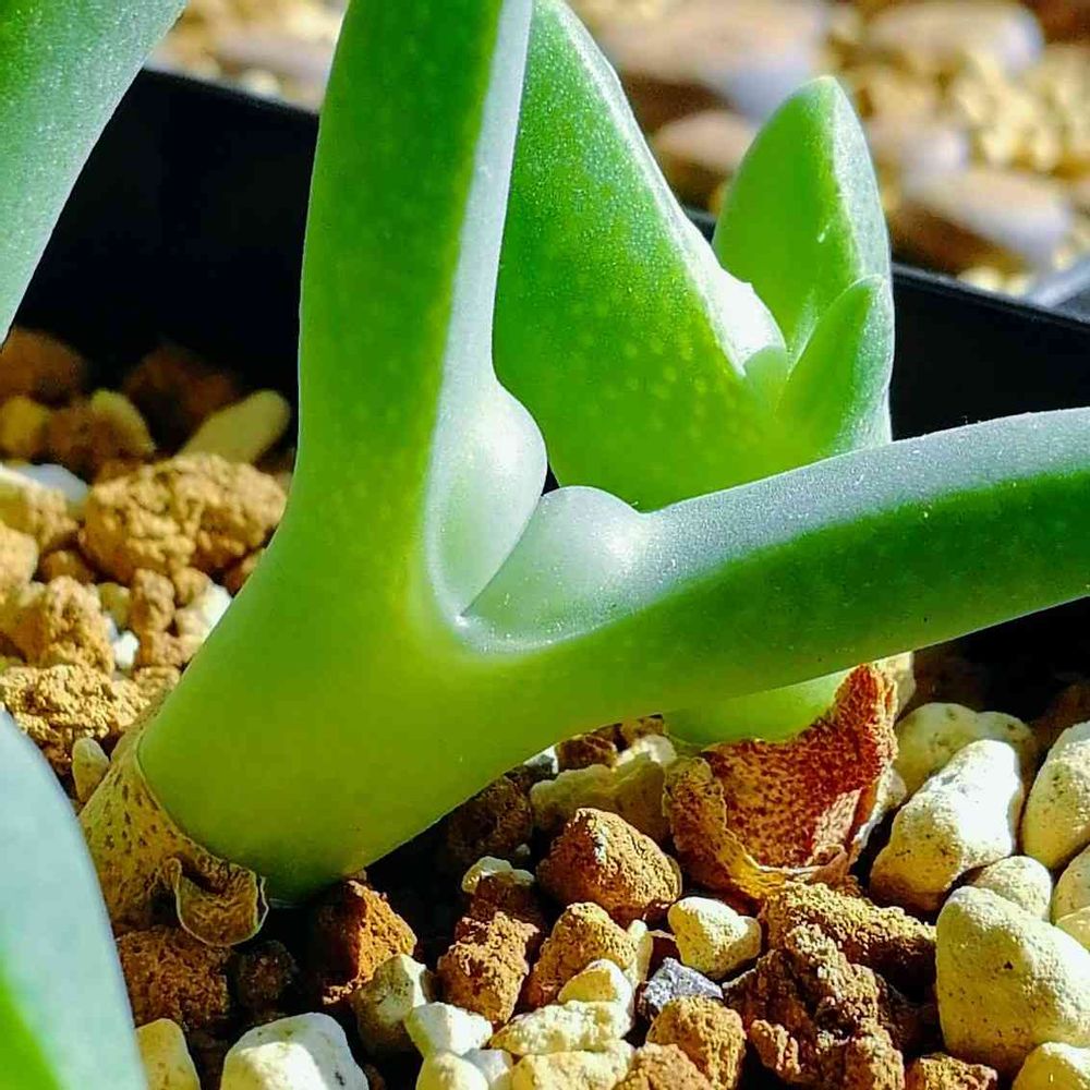 育てている人が少ないであろう、ケイリドプシス・デンチクラタなんですが、ご覧のように、V字型の葉の真ん中がぷくぷくっと膨らみます。定期的に。それでどうなるかというと、真ん中が割れて、新しい葉っぱがにゅっと出てきます。