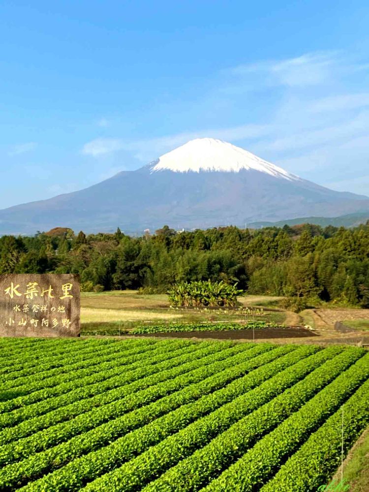 雪をかぶった富士山🗻みどり色の畑と青空とすごく色合いが素敵です❣️