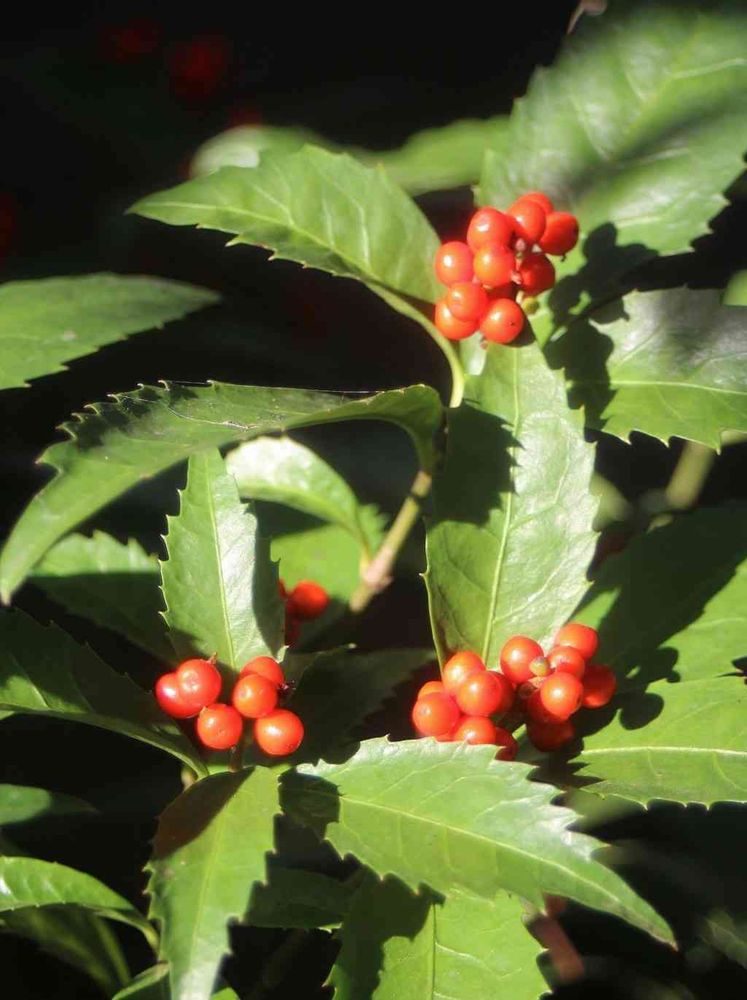 植える場所がなくて、でも庭に欲しくてほしくて、垣根のベニカナメモチの下に、少しだけ入る日射しに期待して植え、やっと赤く色付いた千両❤️