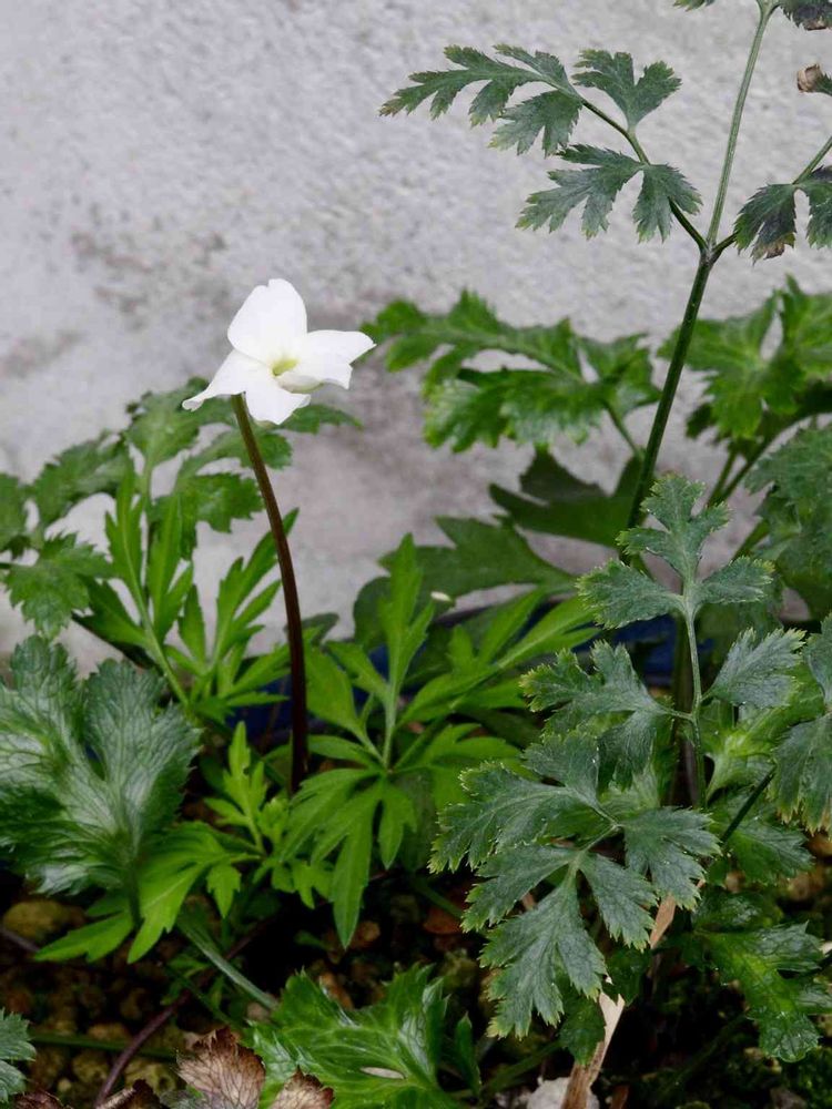 セリバオウレンの鉢に、ヒゴスミレが季節外れの花を咲かせました。😄