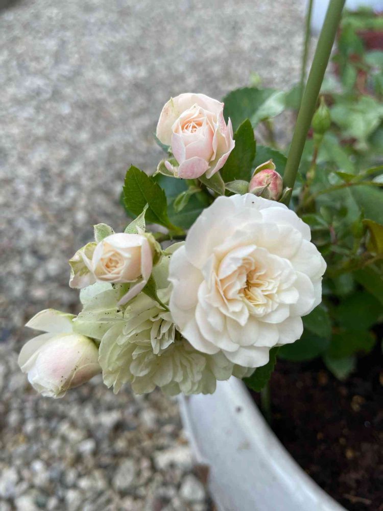 初夏に挿し芽したばかりのグリーンアイスさんが房咲きで咲いてる💕病気に強いと聞いたけど、他のミニ薔薇がうどん粉病に侵される中元気に咲いてくれて嬉しい☺️