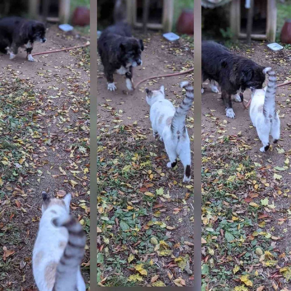 朝の庭パトチロ助手は、先ずはハナにご挨拶…。お決まりの猫パンチもお見舞いして…!?😸🐕