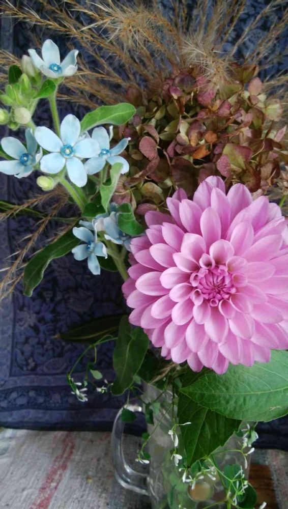 大好きなダリアとブルースターと秋色紫陽花と芒で秋を愛でました。