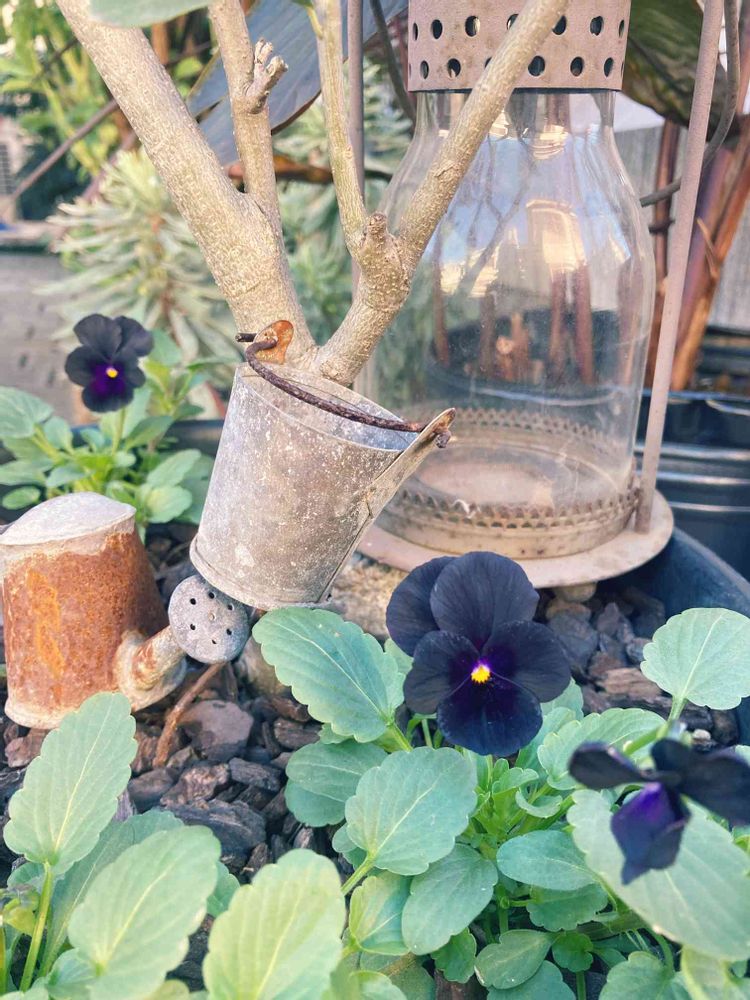 オリーブに植えていたポーチュラカを移し、黒いビオラ ブラック ディライトを。
