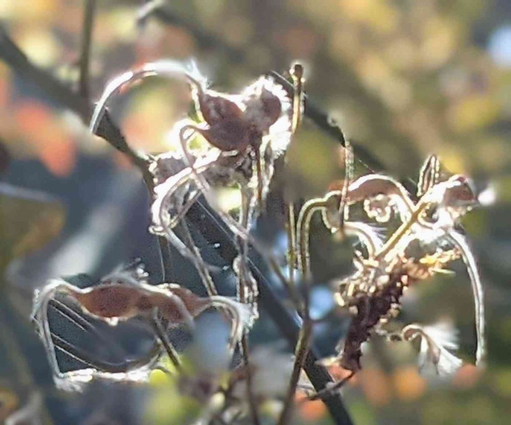 デッキのクレマチス、アルバラグジュリアンスに綿毛が出来ています。朝の光がもう秋色のよう…。