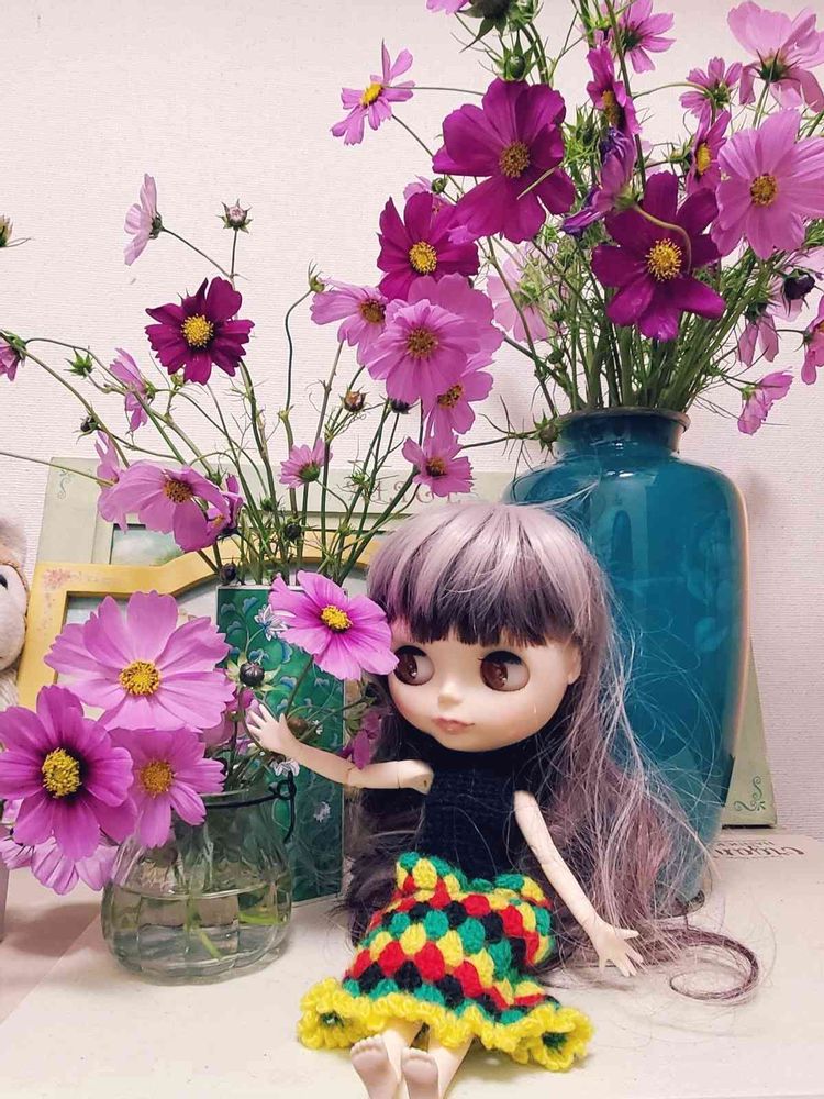 すーちゃんのお人形と同じねと、思いました。可愛いね。コスモスも綺麗です。❤️❤️❤️
