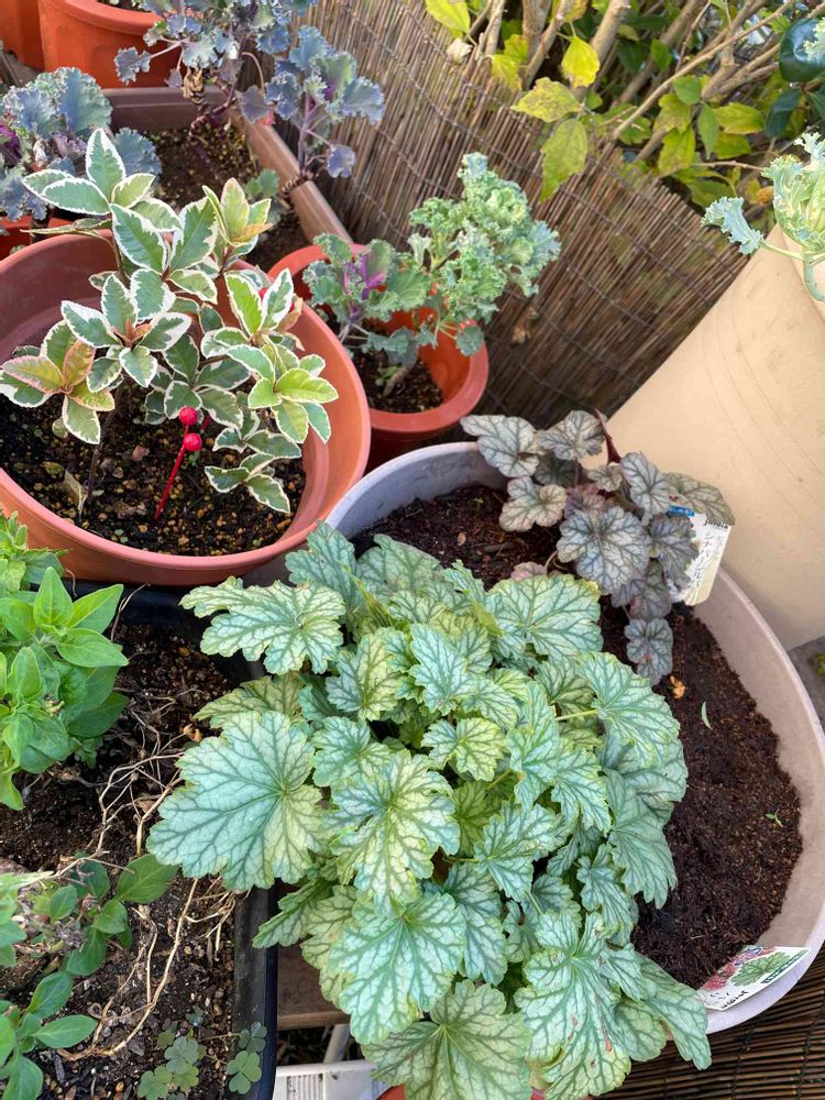 2021ー11ー5(金)晴れ☀️ 前pic10/10の鉢替え土替えの済んだヒューケラケラ2種 連れ帰った時からの勢いがそのまま🥲シナバーシルバー 頑張ってるよね 2種植えはどちらかが消えてしまうコリウス がそうだった〜😅