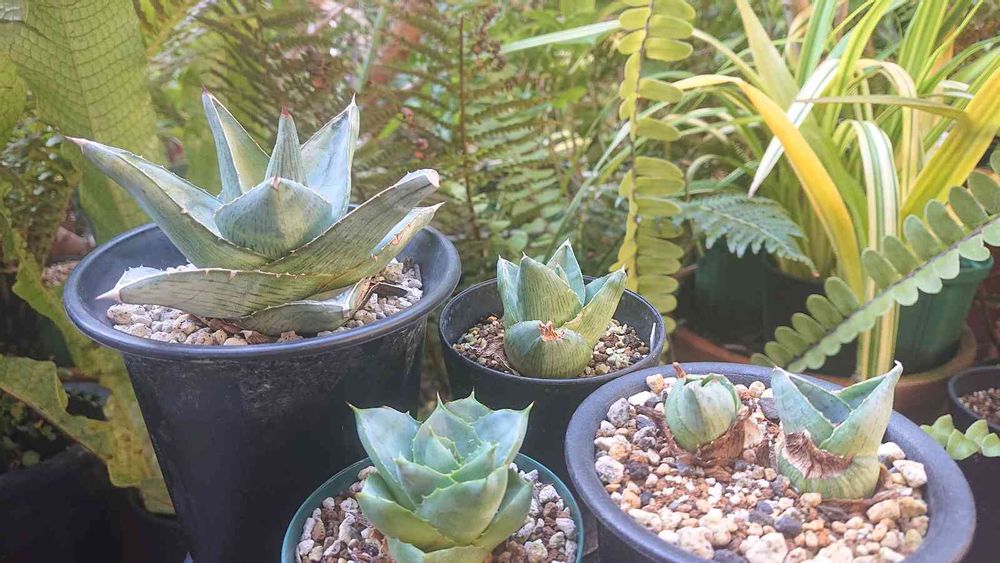 アガベ全般、成長はゆっくりですが、本種クラスターフェストは、小型種である分、ひとつひとつのロゼットは比較的早く成熟します。そして細かいロゼットへの分頭、群生化を続けることで年数をかけて、小ぶりながらも貫禄のある群生株に仕上がっていきます。
