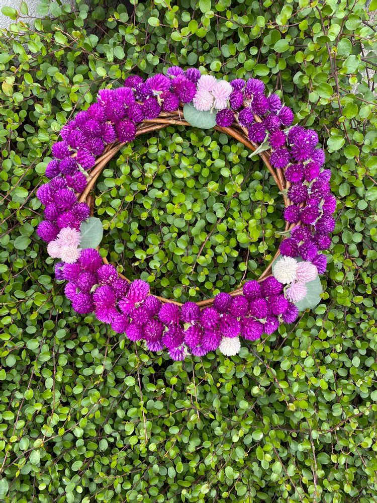 リースは千日紅でバックにはワイヤープランツかもしれませんネ!!