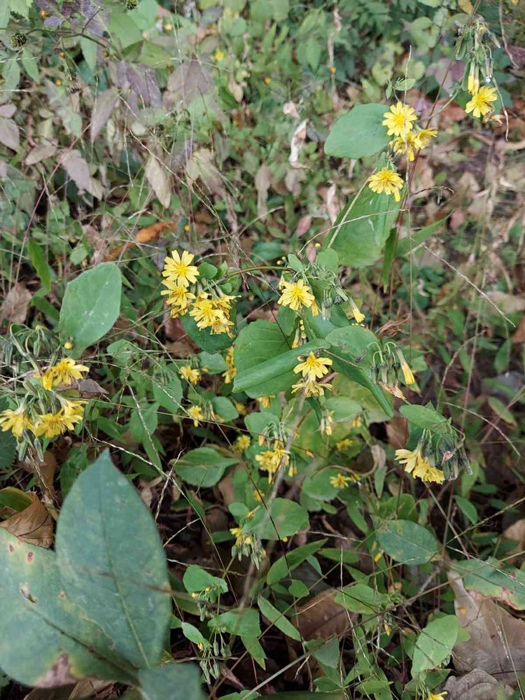 肝心の葉の根元が写ってない(耳型に張り出してシッカリと茎を抱くのが特徴)ですけど、たくさんの花が付く姿、花後はだらんと下を向く姿から「ヤクシソウ」で間違いないです😊