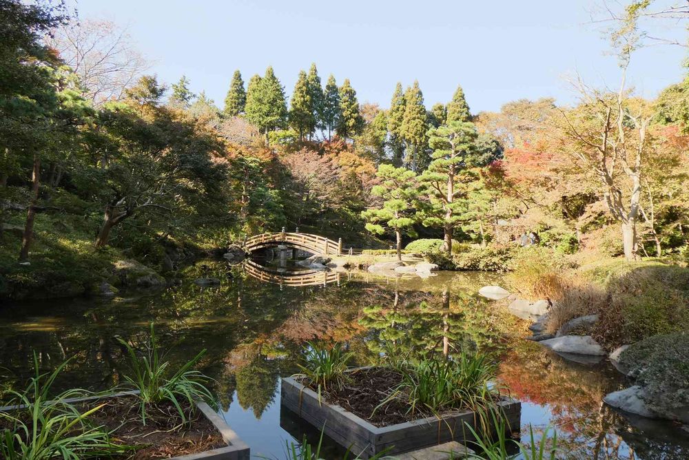 5月には緑が幾重にも重なっていた庭園も、広葉樹が秋の色をまとい出して、松や檜の緑とお互いを引き立てあっています。