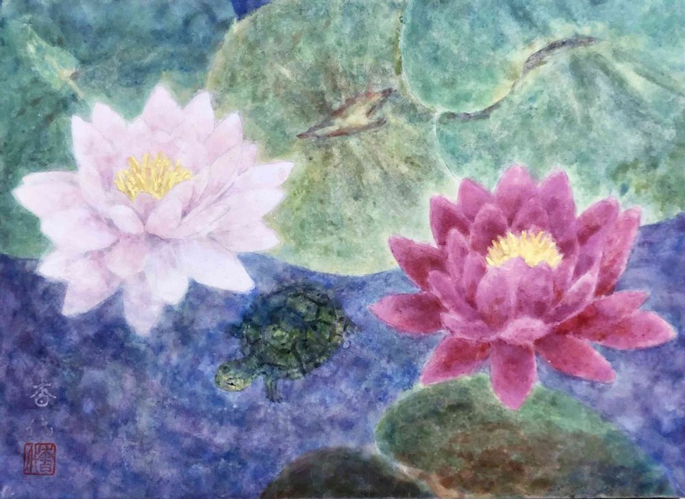 もう20年も前に、我が家に来た赤ちゃんの頃の亀🐢と、睡蓮を描きました