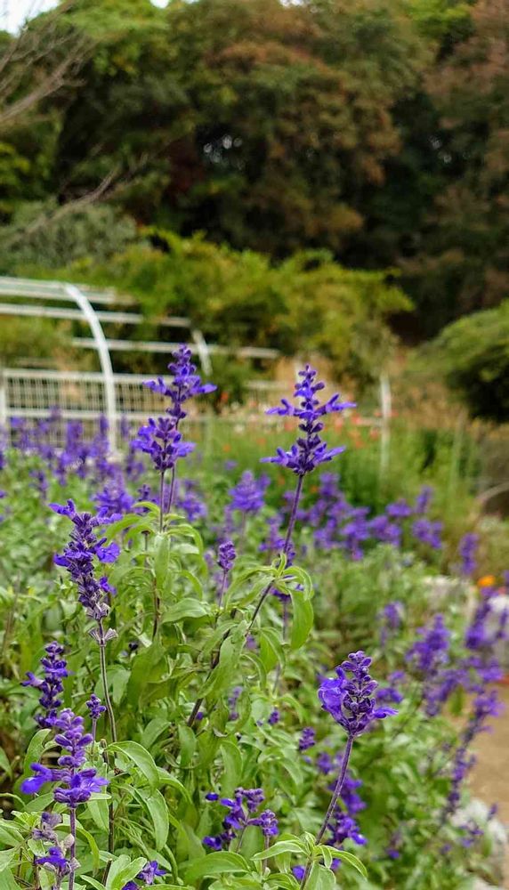 ブルーサルビア 種類はよく分かりませんが 紅葉🍁途中を背景に たくさん咲いていました❗👍☺️