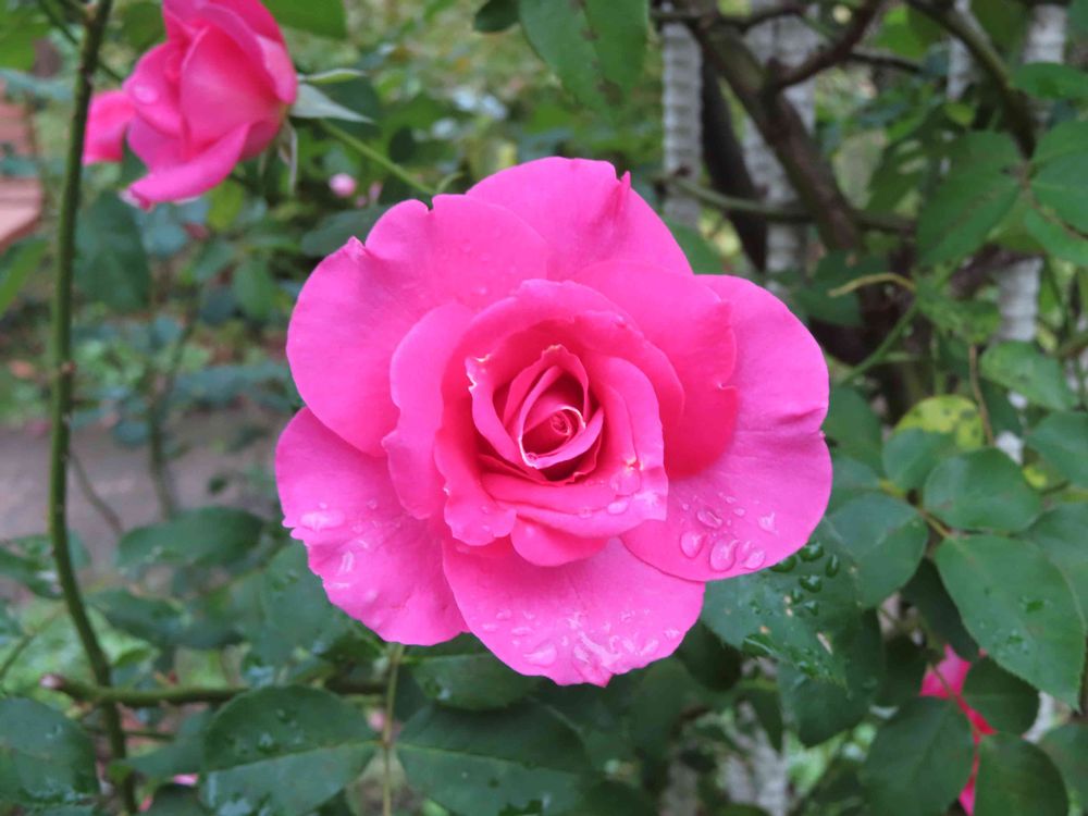 雨上がりの朝、ピンクのバラが綺麗に咲いていました。 パチリ