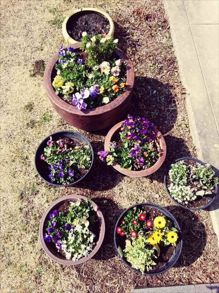 寄せ植えの寄せ集め🌼冬を越して鮮やかに咲いてます🌼肥料をあげたらますます元気に❗下からチューリップ🌷もにょきにょきはえてきました🌷