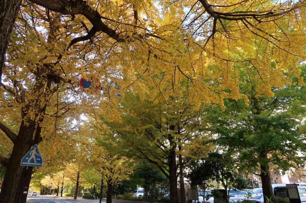 銀杏並木が緑色から黄色に徐々に変わりつつあります。